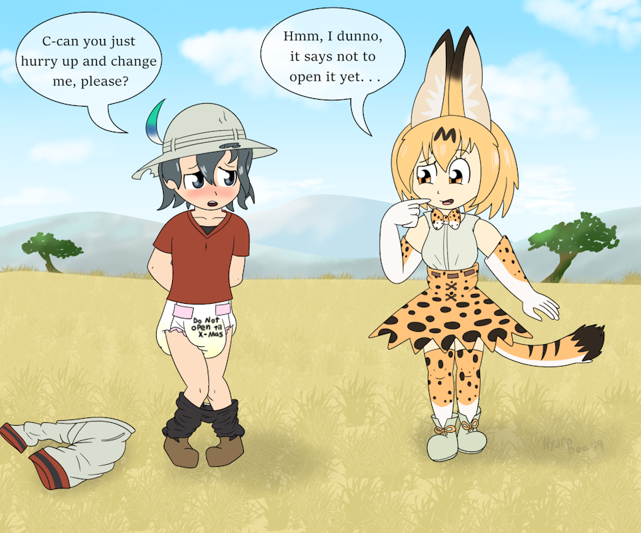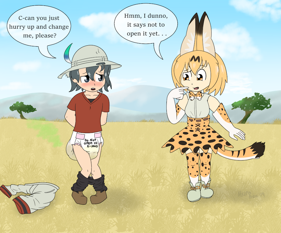 of Kaban and Serval from Kemono Friends. Not sure if waiting until Christmas is the best idea, but that IS what the diaper says.
