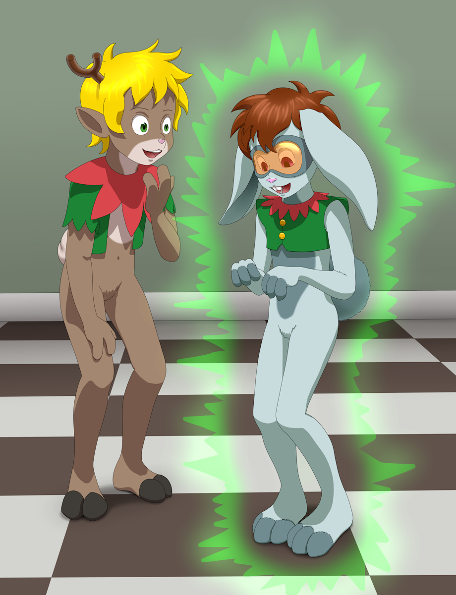 Here we have "Red Rat" Darren transformed into a reinboy witnessing his friend/colleague "Jack Rabbit" Lawrence, who's just been transformed into a bunny, even though he was meant to also become a reinboy. Characters of 'whonew' and Commissioned by Curious4ever, This is an accompanying illustration for his short story here > http://fav.me/ddmr0m6