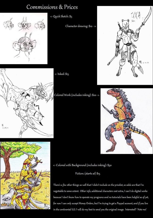 Further Clarification -Absolutely NO adult work, but I might do artistic nudity. If you aren't sure if something you want classifies as adult, please feel free to ask. The worst I can do is say 'no, I won't draw that'. -Extra characters cost...you guessed it...extra. For sketches however, they're free. If you have any questions regarding cost...you guessed it again...ask! -For fiction, I'm pretty well negotiable, but $15 is the absolute minimum. -Every so often I'll do requests and art trades, but I'm currently not accepting any because I've got a whole laundry list of pictures lined up.