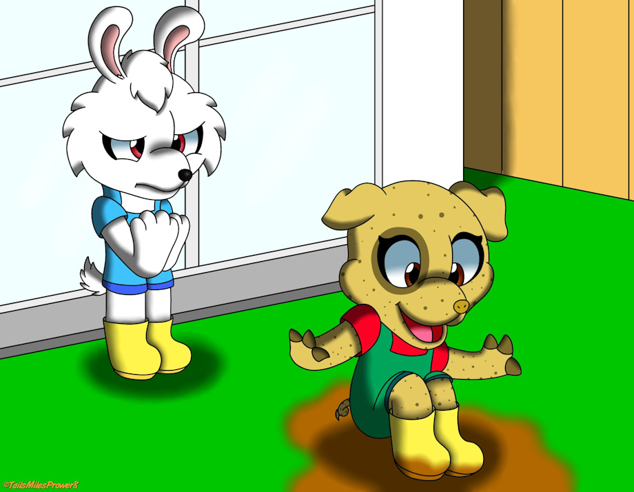 Frank and I aren't enemies, even if he is a bully sometimes. Anyway on a nice spring day after raining. THe two of us venture out in shortalls and galoshes and Frank splashes in the mud. Do we cubs really like that? I'm not sure I want to.