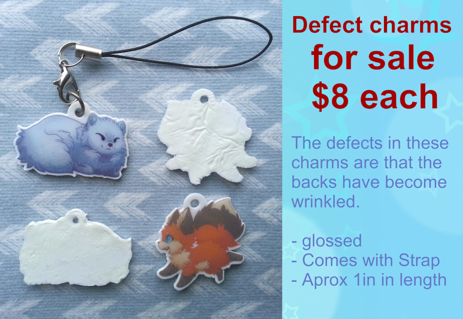Hand made charms, and my first batch. These items are defective. The backs to them are wrinkly. The red fox's gloss is a tad uneven. The artwork on them is completely fine. If interested in purchasing a defect charm, please note me. I will need your name and address to be able to send the item to you.