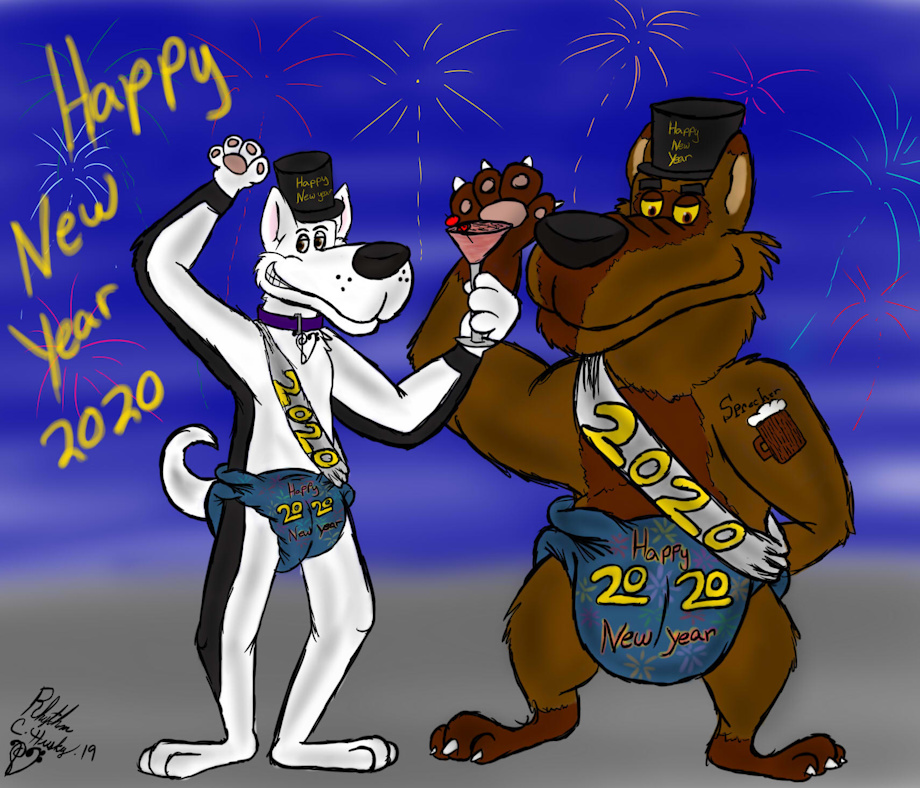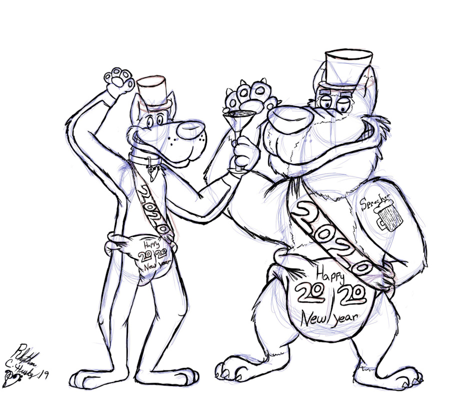 Hey everyone here's a drawing of me and Sprex doing the traditional baby new year outfits to welcome in the new year of 2020 the drink in my hand is a mocktail that is non-alcoholic