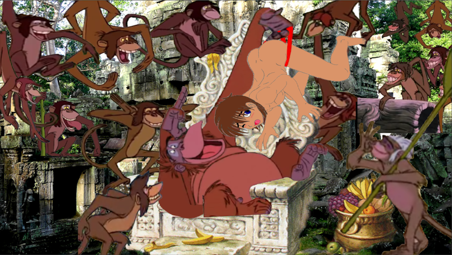 King Louie and the monkeys have fun with the mancub and his loincloth. The guy feels ashamed to see his ass exposed in front of the entire jungle.