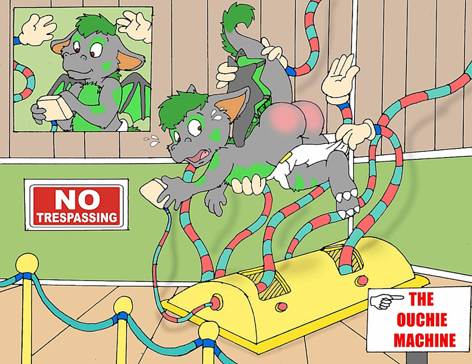 I entered the museum of modern inventions and notice a machine in there labeled “ouchie machine”. I thought it would put a band aid on me so that could be fun. I climbed over the rope and pressed the button. Next thing I knew I was lifted into the air as my tail and wings being raised as well and my diaper being lowered. I looked behind me seeing a couple of robot arms started to spank me as I yelp st everyone. Hopefully someone can help me soon >\\\<