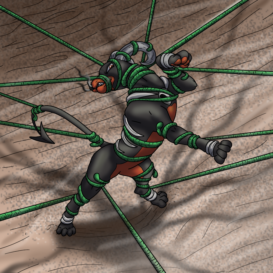 And here is the last of the Patreon rewards for December. This one coming from :iconBondagefan216: This one being another Vine concept. I wanted it to be a little different than the other one though, as I am particular about not just doing the same thing. So I played around with the concept. This is (loosely) inspired by a scene in the Anime actually where Houndoom got muzzled by vine whip. So I went with that concept... so here he is muzzled... and more XD As usual my version is far more exaggerated XD I also experimented with camera angle here, as usually when I do the vine concept it's looking directly from a side view but for this one I went with more of angled shot, giving it a similar view to the roping stuff I do. I think it turned out pretty nice, hope you guys like it.