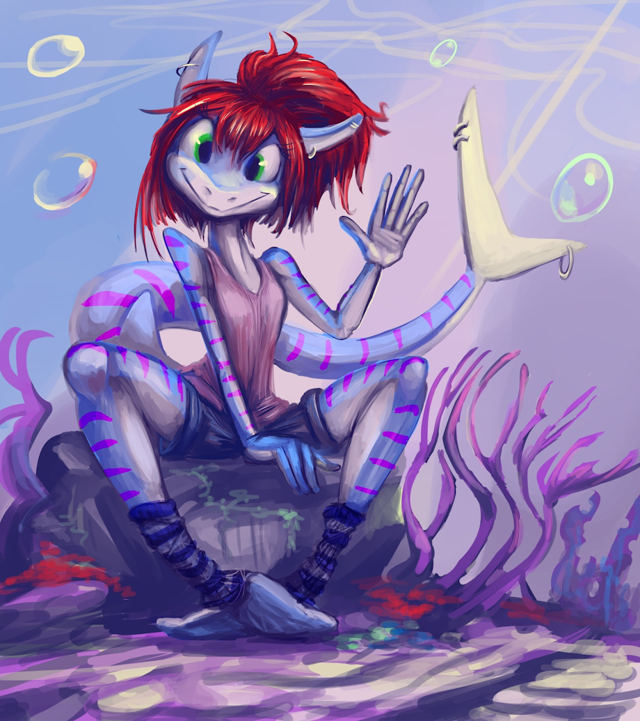 a commission drawing for Klaue of an optimistic aquatically themed being who is named Soxy despite wearing incomplete socks.