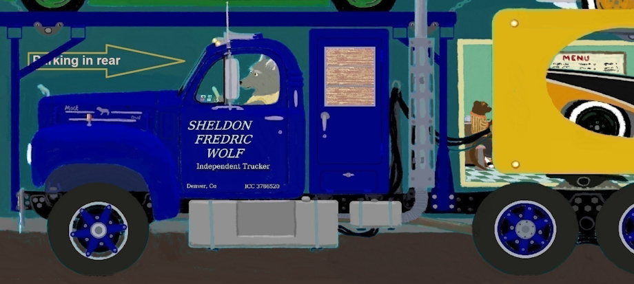 Pic # 2 Close up of the front of Sheldon's rig and of the highway. Sheldon is wearing a pair of olive green work pants (can't be seen in the truck) and a white T-shirt. Sheldon Wolf being an independent trucker, he can dress as casual as he wants. One of the truck drivers, an otter, is at the cafe' counter having supper and coffee. The otter's saddle shoes and small cuff turned up on the pants were in style in those days. The Otter is also an independent.