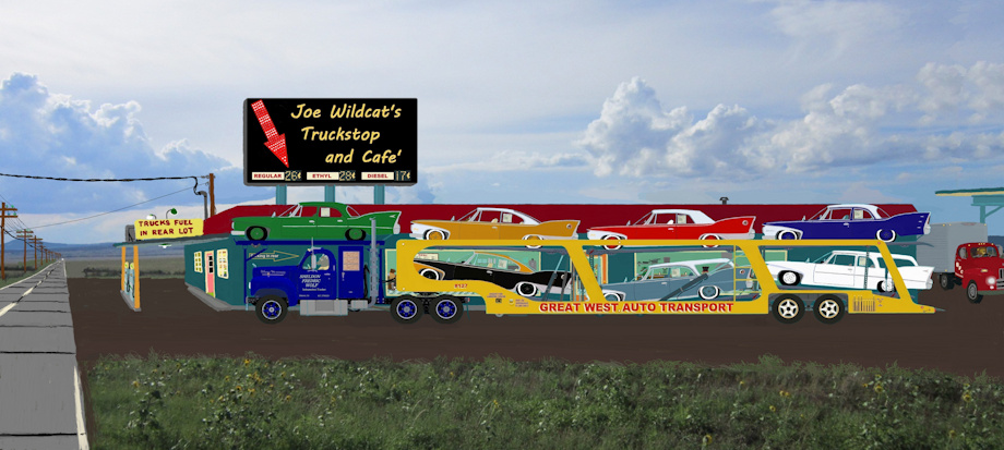 Pic # 1 This is Saturday, July 23rd of 1960. The place is south of the outskirts of Denver, Colorado. It is 7:00 in the evening, and Sheldon Wolf is leaving Joe Wildcat's Truckstop and Cafe' after fueling up his truck and getting some supper in the cafe'. This is facing south in the direction where Sheldon Wolf will travel to deliver brand new 1960 Plymouth automobiles to various dealerships; The white station wagon and the blue sedan is bound for Antonito, Colorado. The red convertible, gold & white coupe and the blueish gray station wagon is bound for Albuquerque. The black coupe and the green sedan are bound for LasCruces, New Mexico. Sheldon, like other independent truckers contracted by Great West Auto Transport, had picked up the load of cars at the Union Pacific Railroad depot in Denver...Those cars arrived along with other cars by rail from Detroit to Denver. By the way...The blueish gray station wagon is the one that Al and Marge Coyote had Dave Pine Martin order for them at Albuquerque Chrysler Plymouth. The highway, part of Route 285, is one of those narrow, concrete slab highways that is barely wide enough for two trucks to pass by each other. Despite the road being narrow, the speed limit on it is 70 mph because of it being so rural. Of course, not many motorists ever do abide by that 70 mph speed limit.