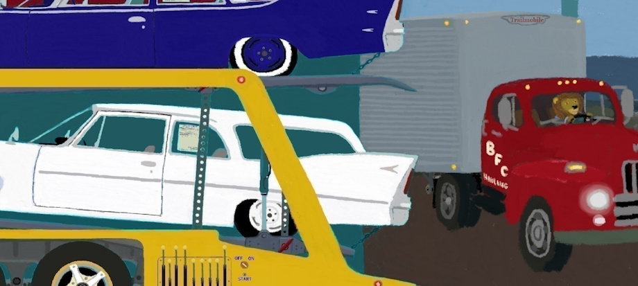 Those cars are brand new 1960 Plymouths. Sheldon Wolf's truck is a 1959 Mack. And the truck the lion is driving is an International Harvester built in the 1950s.