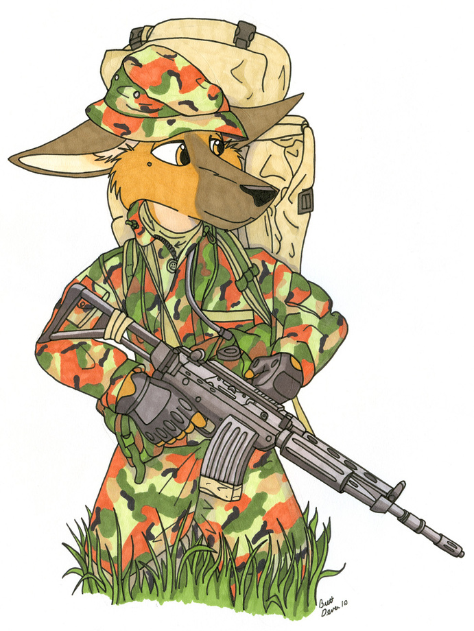 A picture a german shepherd serving in the Belgian paratroops armed with a FNC assualt rifle.