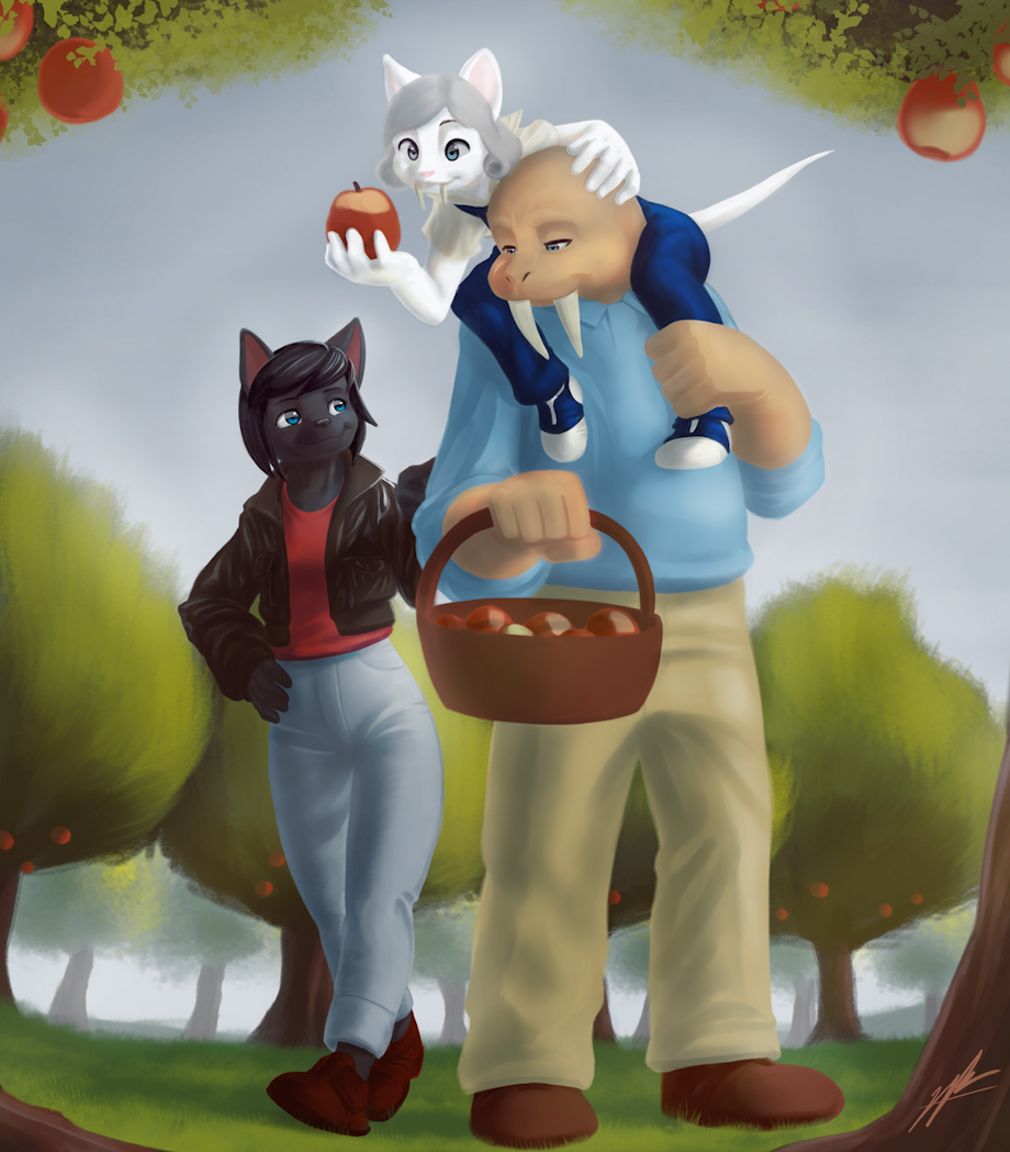 A commission I did for Margareet and Walther of their characters apple picking in their orchard.