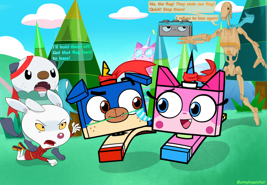 The Red team Steals team Blue's flag as Oshawott does a Master Ima-Gun Di style last stand for the Red team, halting the droid and his team of crossovers and allowing Puppycorn and Unikitty to score.