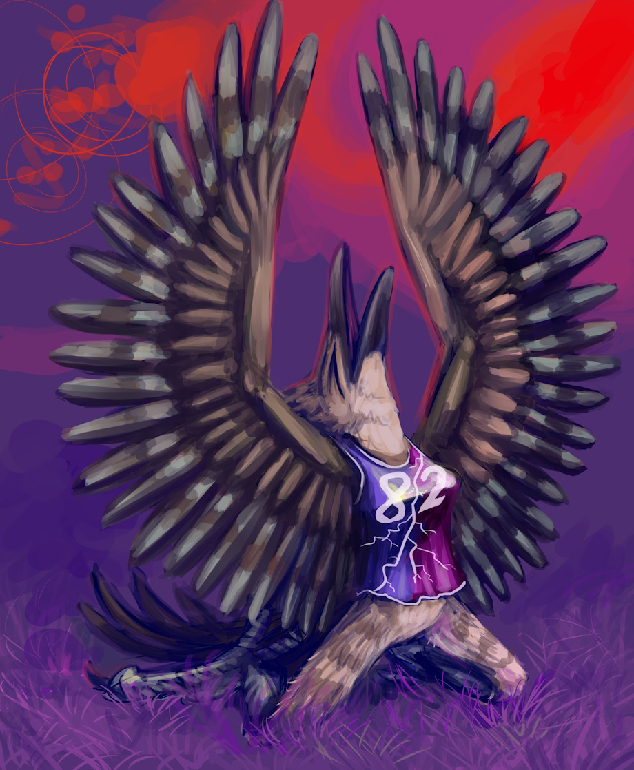 a robision drawing for Goldquiver in which a bird-like person named Skry appears to be celebrating a victory or at least mocking an adversary in some way.
