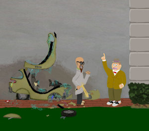 Pic # 1. Right now, Professor Crackinpot is so pissed off about the future car project not turning out, he is operating on the presumption that a good old baseball bat is a good old solution.