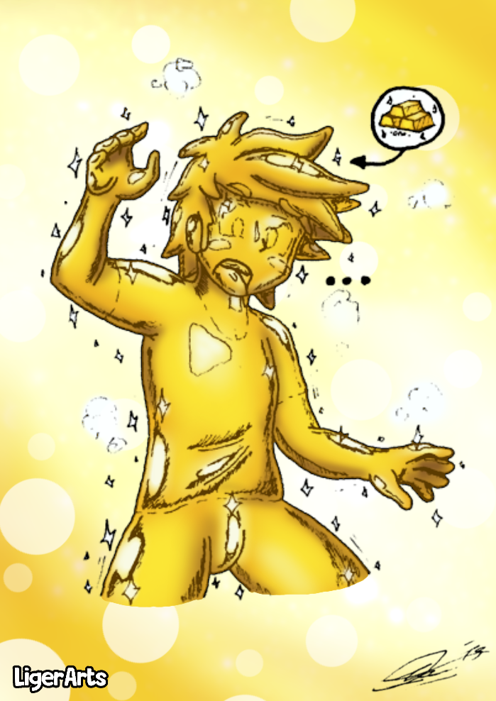 In question of a couple of seconds, his whole body became completely solid gold, freezing and keeping his pose when he was converted.