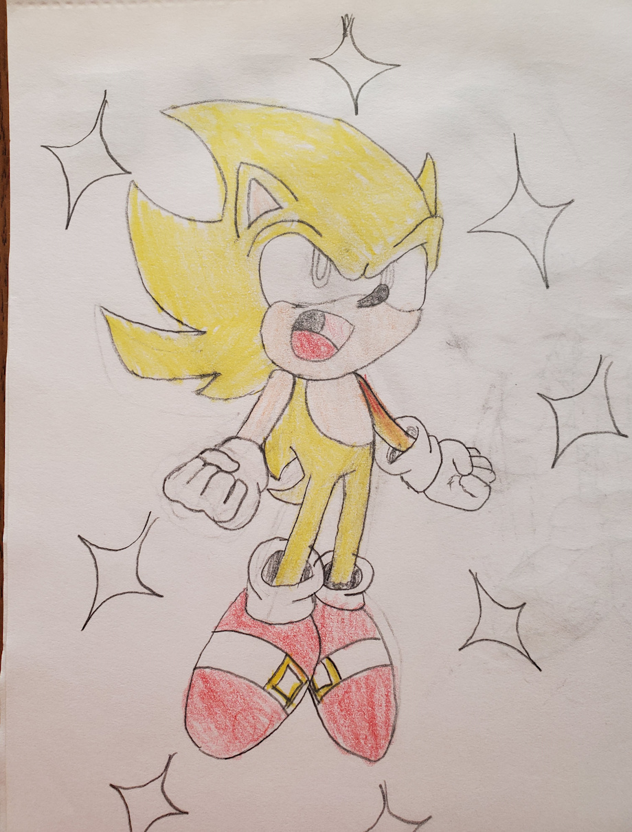 I kinda like this one though. I drew this one back when I was 10-12, somewhere between that age gap. I was drawing that sprite of sonic turning super. It looks like I forgot to color the eyes, and I also messed up the left arm. I think I colored it yellow and then tried to fix it. Now it looks like he is bleeding. lol