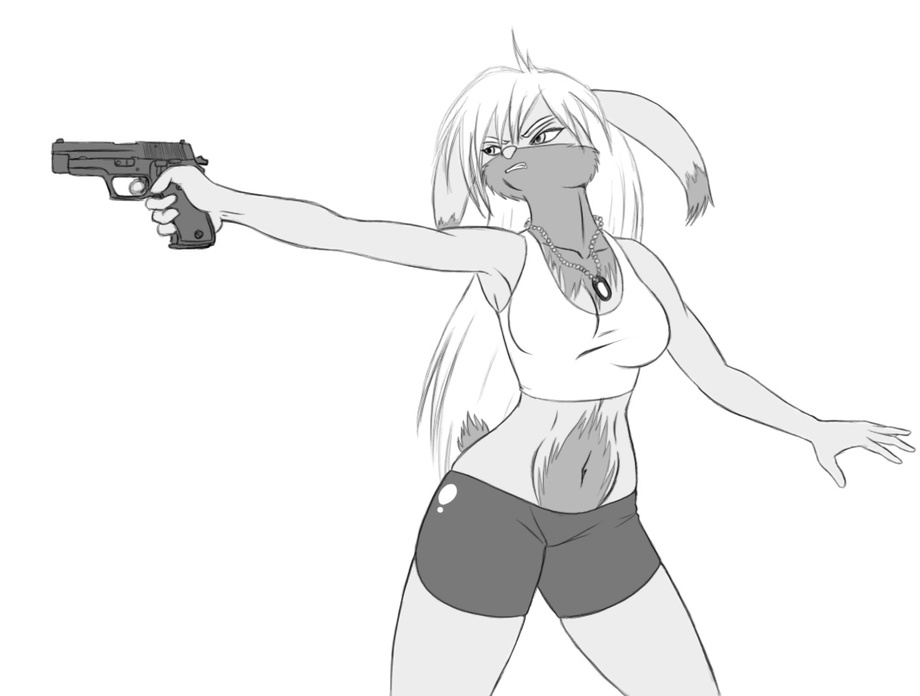 This is gift art from Khal941 on furaffinity, he drew her in the act of turning the gun on someone. Prior to this my gun of choice was the m1911a1 for roleplay. I'd prefer you don't buy or bid on this sketch, I should re-iterate, it was not my hand that drew this.