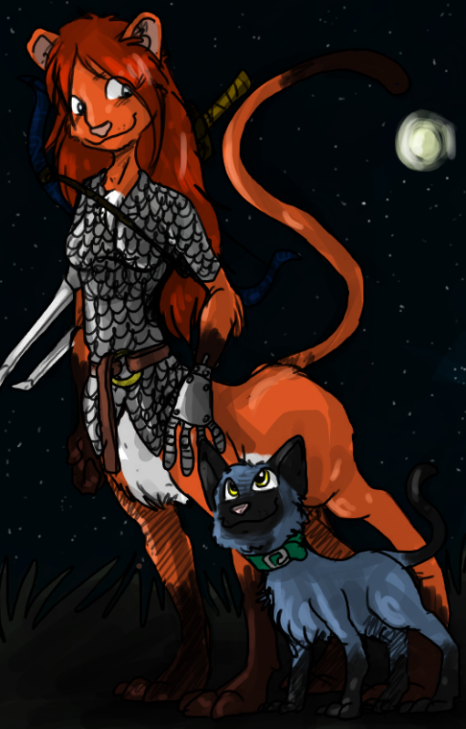 This picture is of Tailswisher geared up in hir Dungeons and Dragons attire; including hir Double Bladed Sword, Longbow, Mithril Chain Shirt, robotic hand, and adopted son beside hir. Hir adopted son is a Grimalkin who was given to hir as a present by the Lord of Pleasures (a Lord of the Dusts) to keep hir in his company in the Demon City of Ashtakala. Hir adopted son, Sardonis is only just over a year old and possibly the last of his species, just like his new mother.