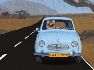 The car in modern times is a German made, Go-Go Mobile, which is being driven by an adult serval.