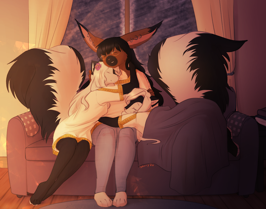 January, when the snow is on the ground and a cold wind soughs through the bare branches, is the perfect time to snuggle up in front of a nice warm fire. Megan has decided to do just that, and joining her for a pleasant evening in are Carrie and Cassandra, two of the sweetest young skunklings on the planet. Or any other, for that matter. More than that, they are a part of her family, a fact that fills her heart with pride. In celebration of this, they have given her a tunic which they made, a gift given only to the most special people. As such, she will treasure it, and them, for all time.