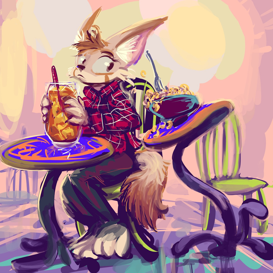 free not-necessarily-a-sketch number 79 for MemocaTheGull, in which a fox person named Raven just wants to drink some iced tea without being hassled by macaroni and cheese