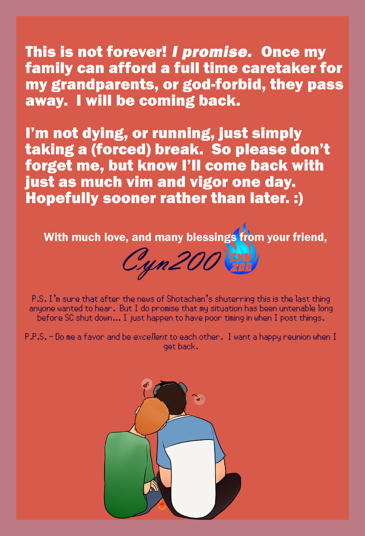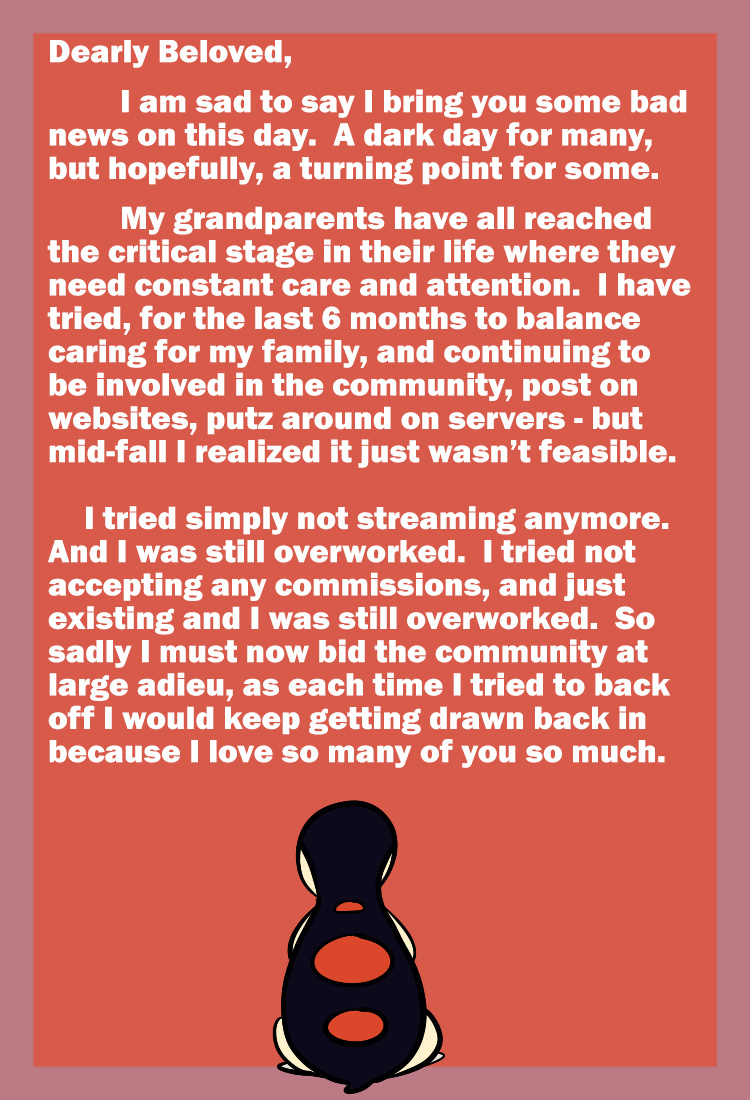 TL;DR - My Grandparents are sick, I need to focus on taking care of them. I do not have time to do art/be a presence online. I will be back one day.