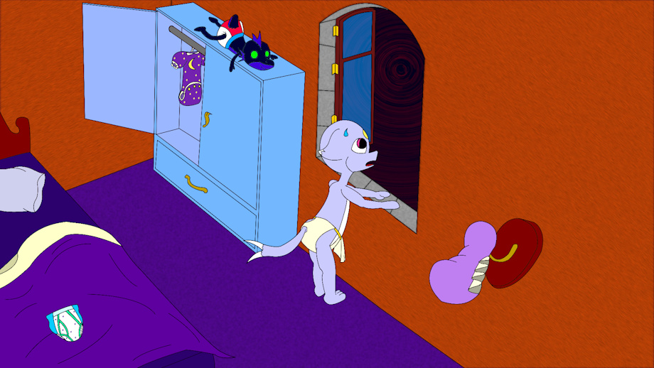In this book, Culania is in his onesie at all times, and while it appears that he has a diaper under it, and several of his plushes also appear to wear diapers, it is never explicitly stated that they are all still in diapers. Ironically, I thought up the idea of them not being diapers, but loincloths, in the event the diaper idea wanted to be subverted.