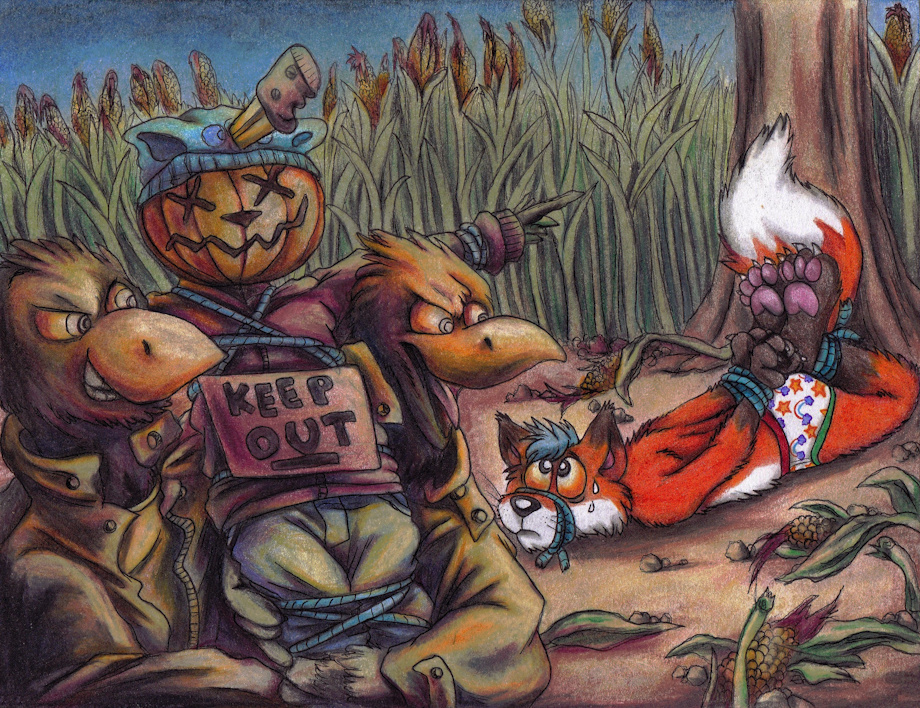 Shortly, the fox is left hogtied on his stomach, watching, as the crows quickly build a dummy and dress it up with his clothes; they stuff it with straw, and tie it firmly, before adding a crudely carved pumpkin for a head, and nailing the fox's hat to it with a kitchen knife. They add a warning sign as a last ominous touch to their creature.