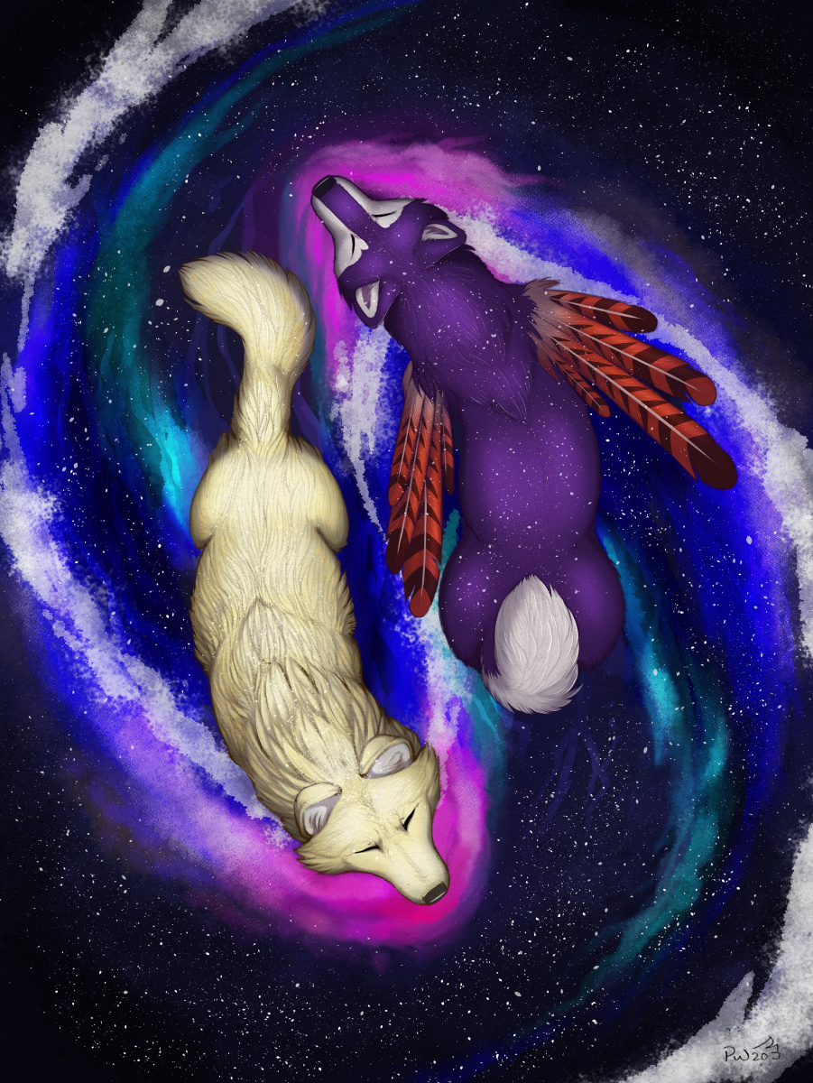 Back then, the Yin Yang piece was an expression of the two sides of Nagi, their characters in a circular pattern. I went with a more oval ying yang this time, drawing them swimming through the cosmic ocean. It's a concept that comes up a lot from astronomers like Carl Sagan. I looked at the "wakes" of boats to try to get the general shape like boats going through the water. I wanted the feeling to be spiritual. Fursonas are close to our hearts. I really loved working on this, it felt like meditation. Thank you <3