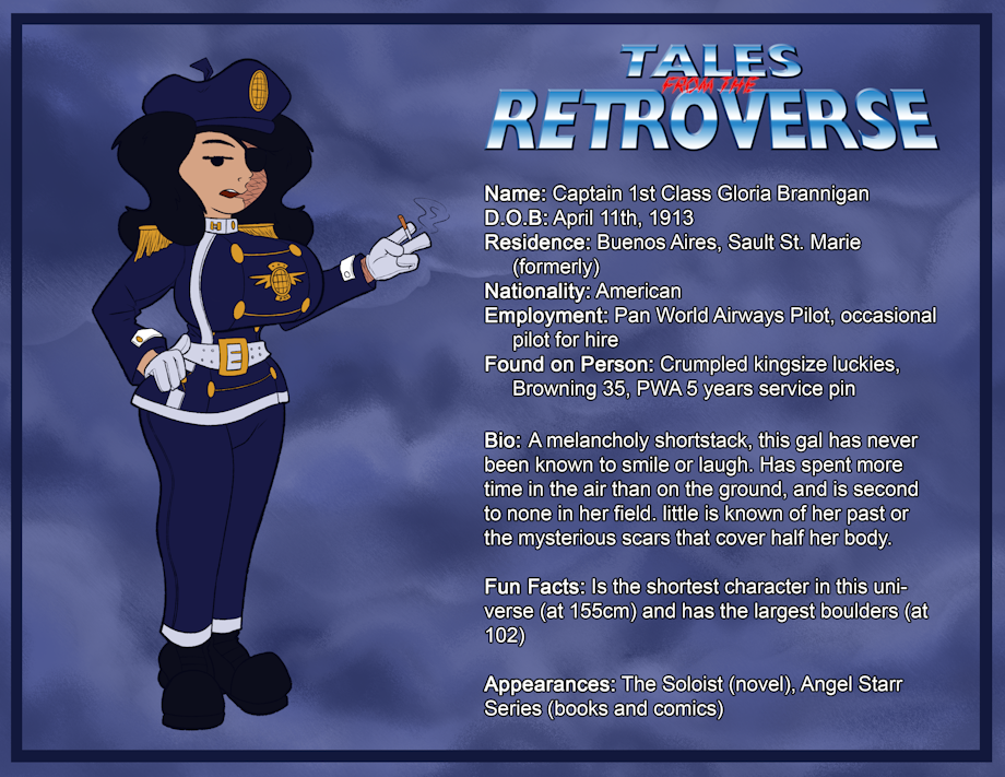 About time I do more with my characters, so let's start with some bios. Here's Brannigan, My first OC wearing her work uniform. Retroverse is the name I gave to my fictional universe.