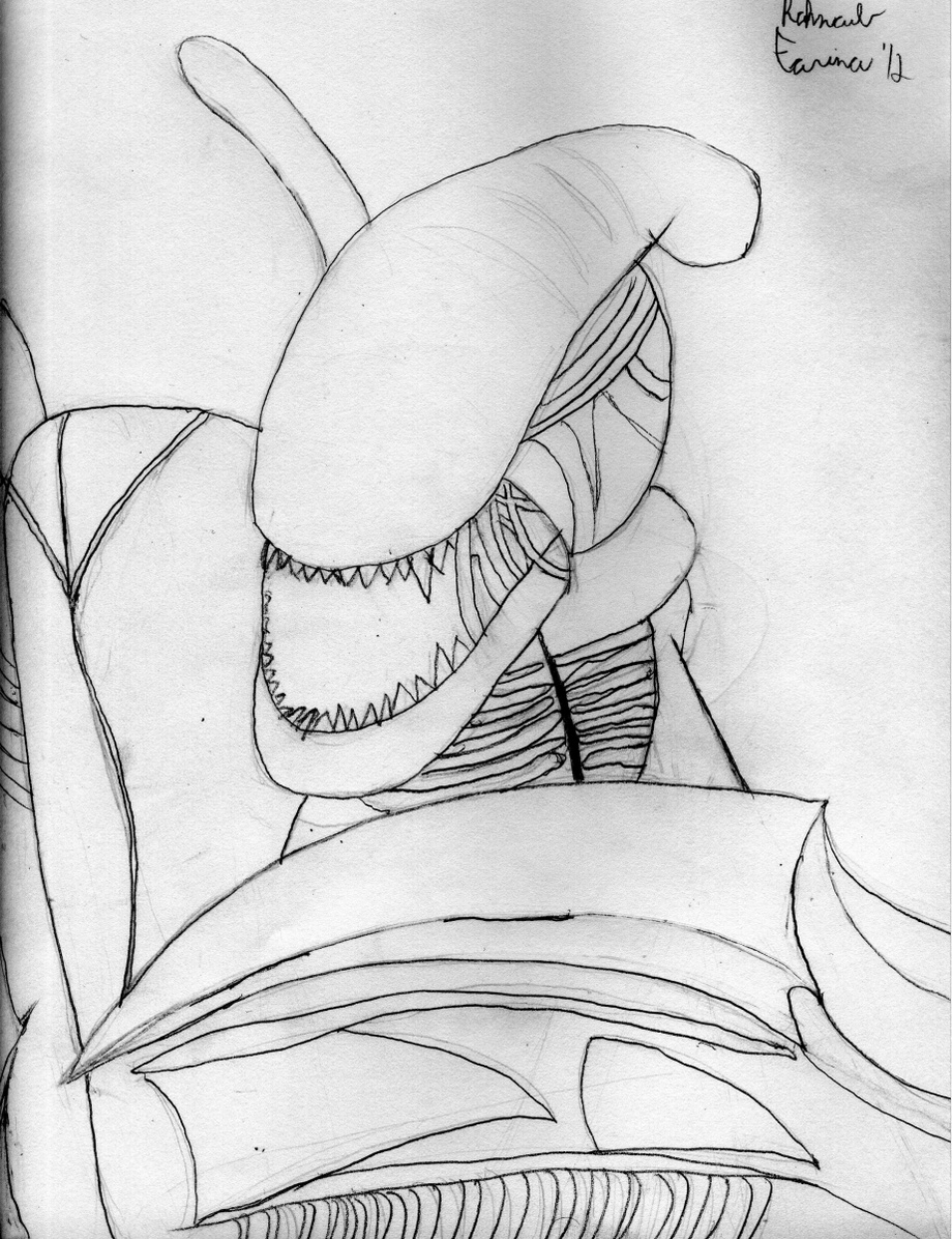 Okay now for the serious part. I'm not entirely happy with how this came out but I partly blame my ref pic: http://upload.wikimedia.org/wikipedia/en/thumb/2/26/Al... See...the worst part is how the arm at the bottom is supposed to cross over behind the bladed tail part. But as a sketch it just looks like a blob mixed together. I was not about to use up a TON of black just to differentiate the two, so...yeah I know about the arm and the tail. As for the rest of the missing details yeah, I know. Its partly because I could not see worth shit ._. Not one of my better pictures but I was inspired.
