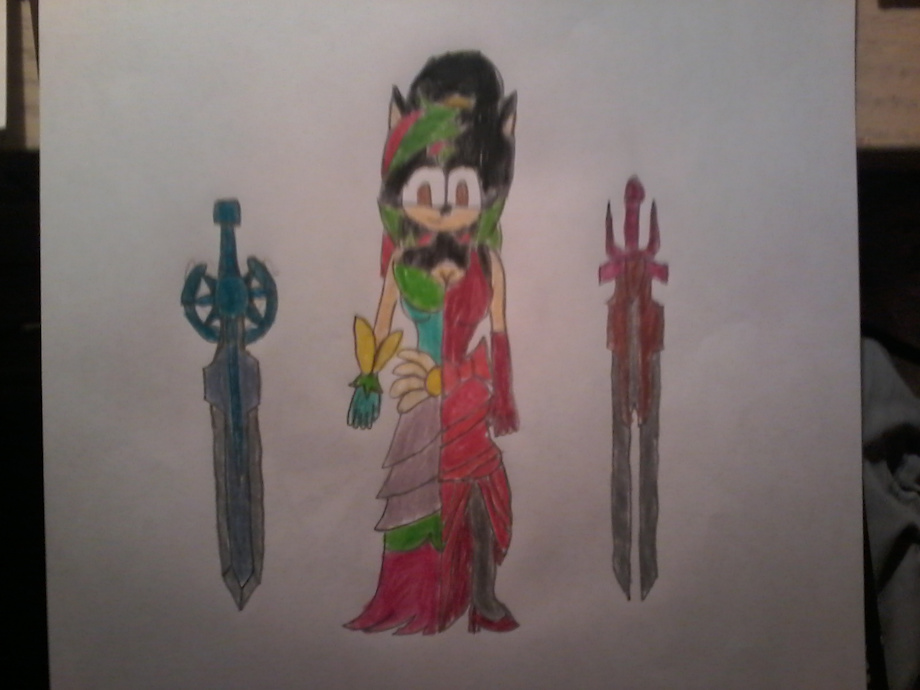 "This is Tiff's second set of dress and sword and this time, it was both "Nature Flower" and "Red Gala" with both "Holy Sword of Great Heaven" and "Crimson Blade". She used Nature Flower (strapless dress) for any nature theme event or having play with Fluttershy and her sword produce wind-like blade attacks while she used Red Gala (one strap dress) is one of many dress she used for gala or grand ball and her sword had a gap in between the blade and use that to snap off any enemy's sword. Well, that's pretty much about these two and please send out more ideas or dresses and swords." - Universe 1029