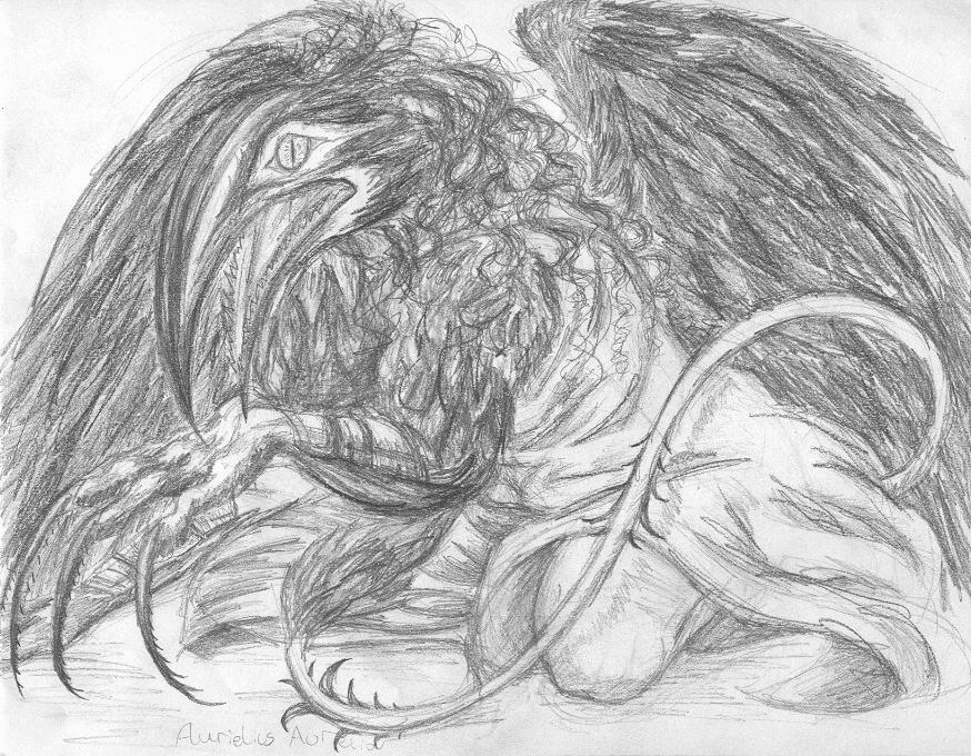 Aurielius turning into the demon-gryphon, or more affectionately known as the Grymon. Drew this with normal pencils and paper around 2007.