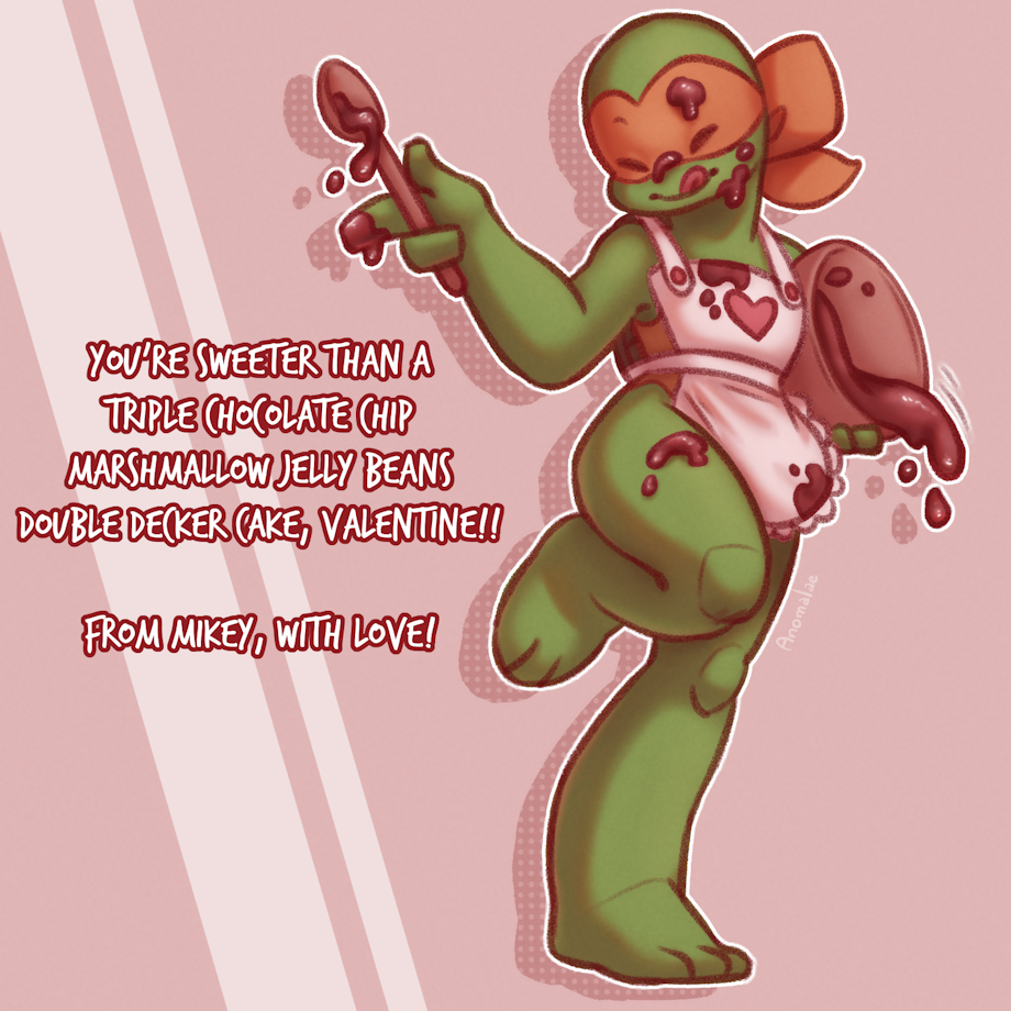 Oooh~? I'm always searching for more tmnt doujins if you come across any 👀 Now, Mikey posing with pizza seems so natural. It reminds me of your fanfiction "Everything but the Kitchen Sink" with the whipped cream and all!