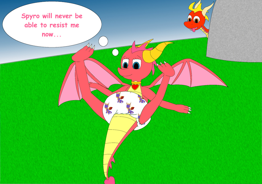 Ember is desperate for Spyro’s heart again after an affair with the Armadillo she crushed on. Sadly, Spyro had his eyes on other, more attractive dragonesses. Ember was willing to go to great lengths to win Spyro back. To that end, she learned how diapers made dragons look cuter, so she had one of the artisan dragons make her a set of thick disposable diapers with Spyro prints on them, which she feels will show Spyro how much she wants him. Unfortunately for Ember, she also has a secret admirer in the form of Flame, who seems to have fallen for her tactic even though it wasn’t directed at him.