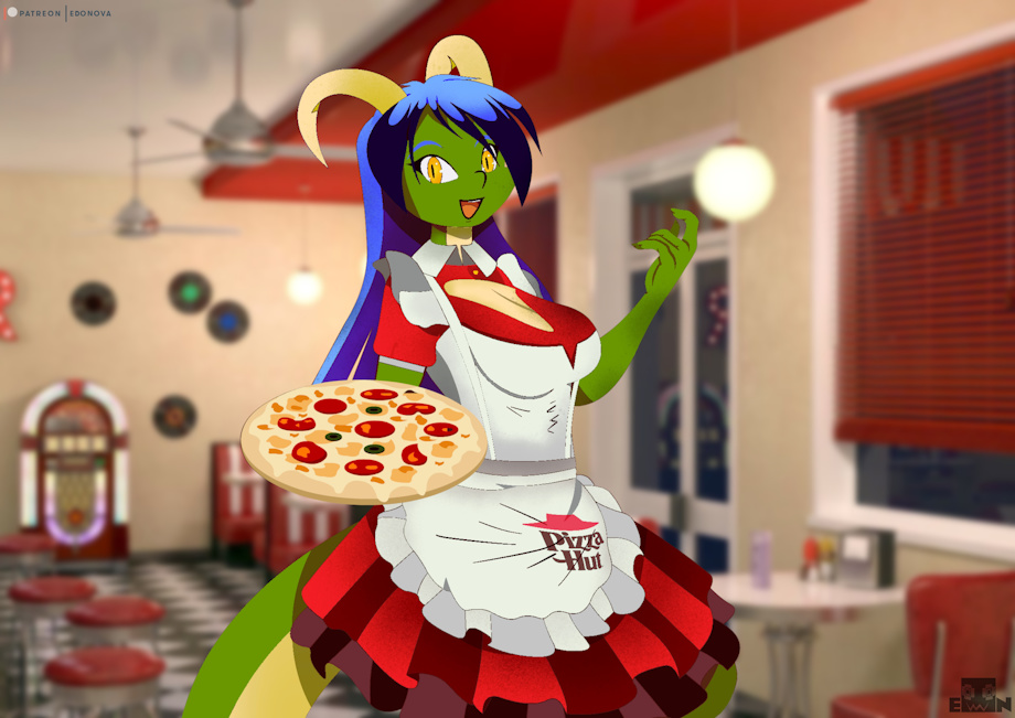 ENGLISH Well, I finished the second part of the challenge, this was to dress one of your characters with the waitress at Pizza Hut, and people voted for Maylin, what do you think?