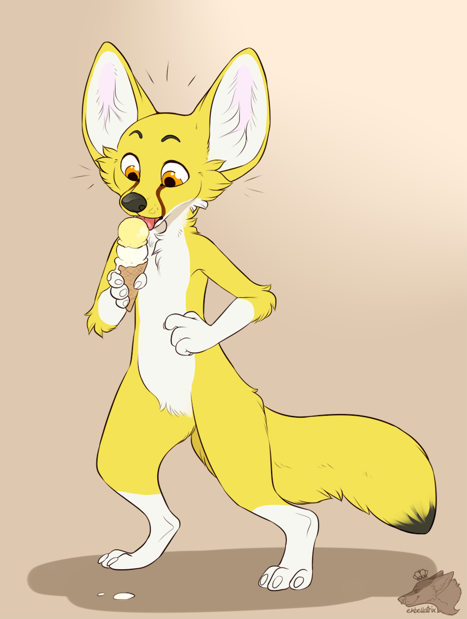 As a true desert fox, Limon loves hot and sunny weather! Especially when he gets the chance to lap up a delicious ice cream to cool him off a bit. This one seems to be his favorite flavor, too. What a lucky fox! Though it looks like his tasty treat isn't taking the sunshine too well. Quick, Limon! You'd better hurry if you want to enjoy your ice while it's still frozen. It would be a shame to let it melt away!