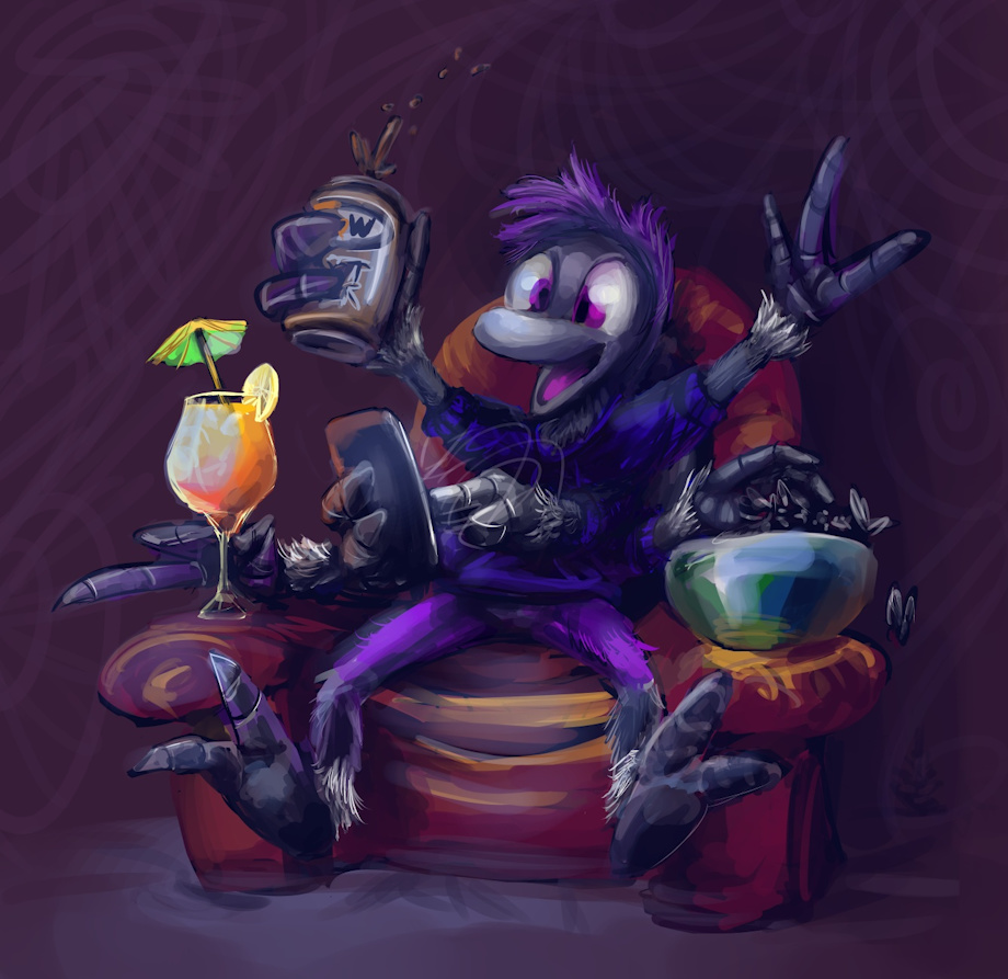 a commission drawing for Goldquiver in which a spider person named Druva finds that extra arms are essential for the most efficient entertainment experience