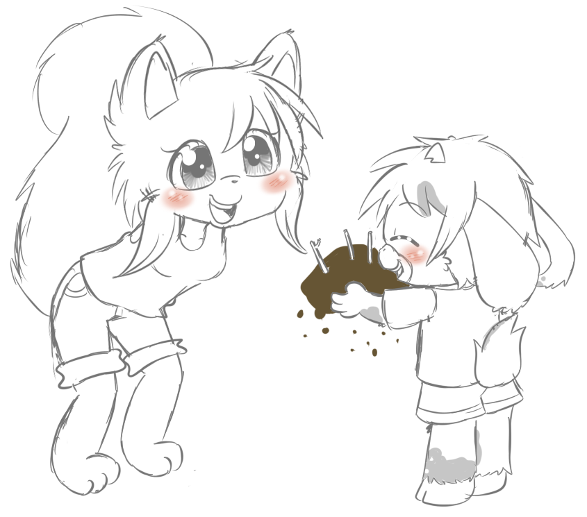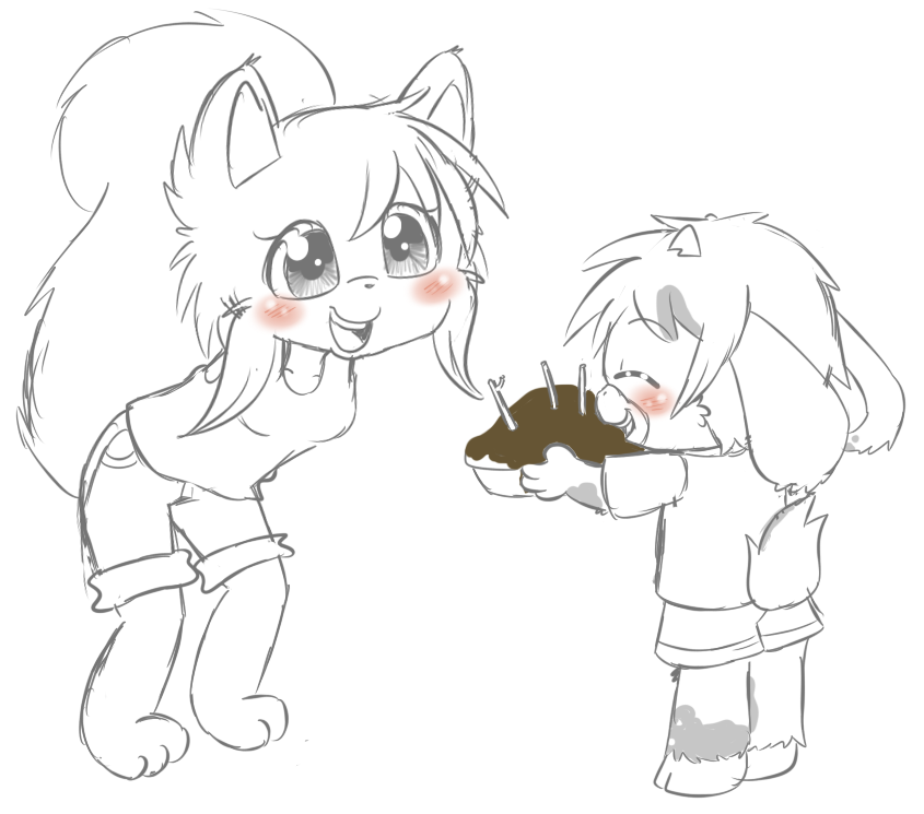 Tosh made Muriel a birthday cake. He's not allowed to use a real oven, and doesn't know how to bake even if he did, so he made it out of mud with twigs as candles. He also can't count yet, which doesn't really matter since he didn't know how old she was anyway, so he only used 3. Muriel looks happy about it and he looks happy about it. It's all happy and sweet... except for the cake, which is actually very earthy.