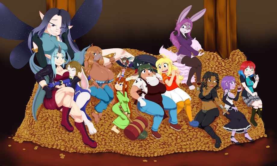 -Hikari, at the top, with starry fairy wings -Dracos123's Dragoness Dee, smiling as Hikari boobhats her, Wyld hugs her and touching the top of Ellie's head with her tail. -Bunnehwyld's Wyld in Rabbit form, tightly hugging Dee -Ellie, with gigantic tits, sipping from a lamp/glass -Malkaiwot in her little Imp form, holding Kotori's arms -ShrinkyDinks's Kotori, being held or rather pulled by Malkaiwot, the smallest one of the picture, you may need to zoom in to full display to get a view of her :y -Dracos123's Raya Sprite, holding her signature hammer, with Kotori on top of her head. -Marnie, a HuCow, drinking milk off a large beer mug. -Osakatan's Miyo, encouraging Marnie to drink. -Kitsuna in her Rabbit form, tossing a pillow directly at Miyo's head. -RedneckDemon's Rosa, sipping on wine while teasing Asmi's hip, is she drunk? -Asmi, also with a glass of wine while looking nervously at Rosa. -Lucky7even's Angel, on the right corner, looking at Asmi.