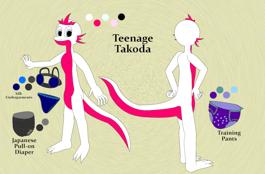 Takoda normally wears regular underwear in this form. After her regressions, however, she started developing a liking for diapers and pull-ups, and occasionally wears them instead. The Japanese one, which I first saw in a friend’s pic, was the one she wore as a baby in the “Captain’s Log” comic. She wears other types of underwear, diapers, and other clothing too, these are just some cute examples. Tribal loincloths and stuff would look good on this form as well.