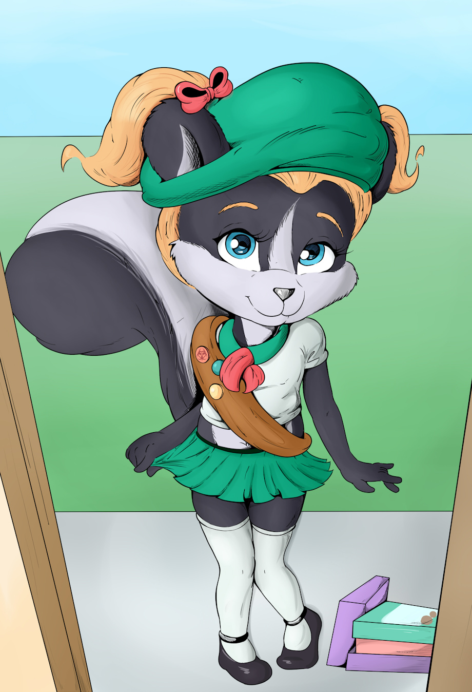 All by herself, door to door? What a brave, or naive, lil gurl- You should have her unintentionly lifting her shirt/skirt up, my immersion is ruined by trying to understand that the girl scouts would issue such a high skirt and shirt~ Or did it shrink in the wash--