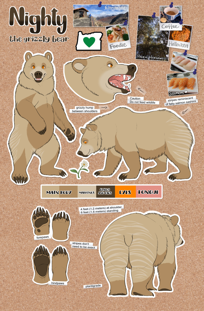 I have gotten a lot more used to drawing bears, so some aspects of how I draw her have changed since my previous reference (2017), including how I draw her snoot and lips. Also I noticed a lot of artists had problems understanding how I drew her arm and leg markings, so I drew the standing pose to hopefully help. This also more clearly shows the belly and how it connects to the chest, which wasn't shown before.