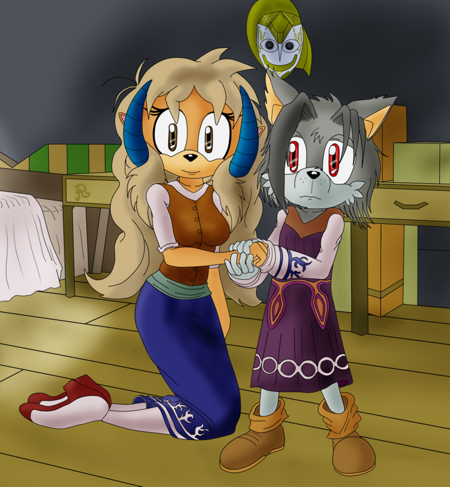 Kafei and Anju. Well, quickly said, they're fiancés. But the evil Skull Kid transformed Kafei into a 8 years-old kid just 3 days before the Wedding ! Marvellous :D ! So he's hiding from Anju now. And because we love to see more troubles, the poor Kafei got his wedding mask robbed, the Sun Mask.