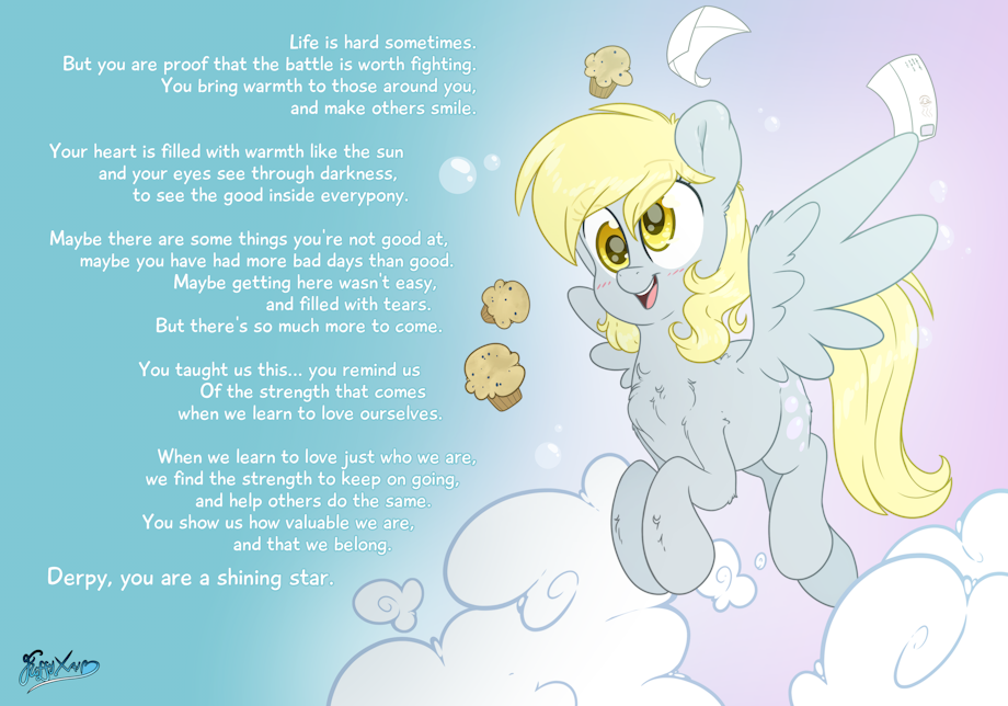 Here's to a pony who touched our hearts and brought us smiles when things were dark, brought us strength when things are hard, brought us hugs when we were lonely, and muffins when we- well all the time, really. Derpy, even being a character who has found life and character mostly through the fandom, is a strong and inspirational character whom I honestly love so, so dearly, as many do! She is such a fascinating concept, and such an incredible, lovable, silly and fun, caring and warm pony with big beautiful eyes filled with love and compassion. I love you, Derpy, we all love you.