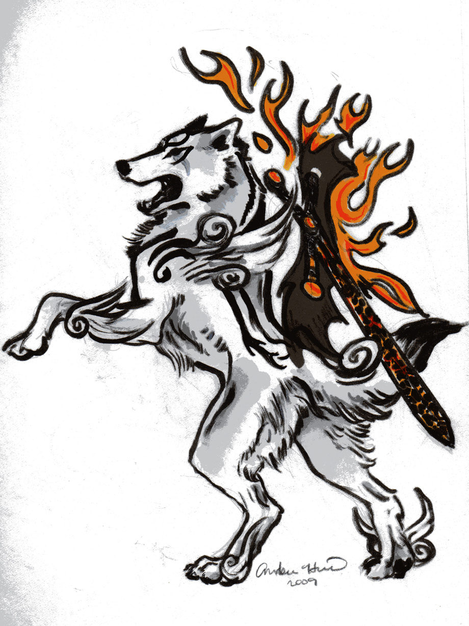 I got this at FC from vantid who is amazing at doing art in the Okami style. I saw her art, and me being an avid lover of the game (Though admittedly I need to play it a bit more), I had to get Kaji done in that style. He's white with black markings because I wanted him to be akin to Amaterasu in that way, colors only really. That's where the black markings came from, and the weapon... Ooooh, the weapon! That makes it /perfect/ for Kaji! Besides, I can actually see him wielding that with some lightning beads around his neck.