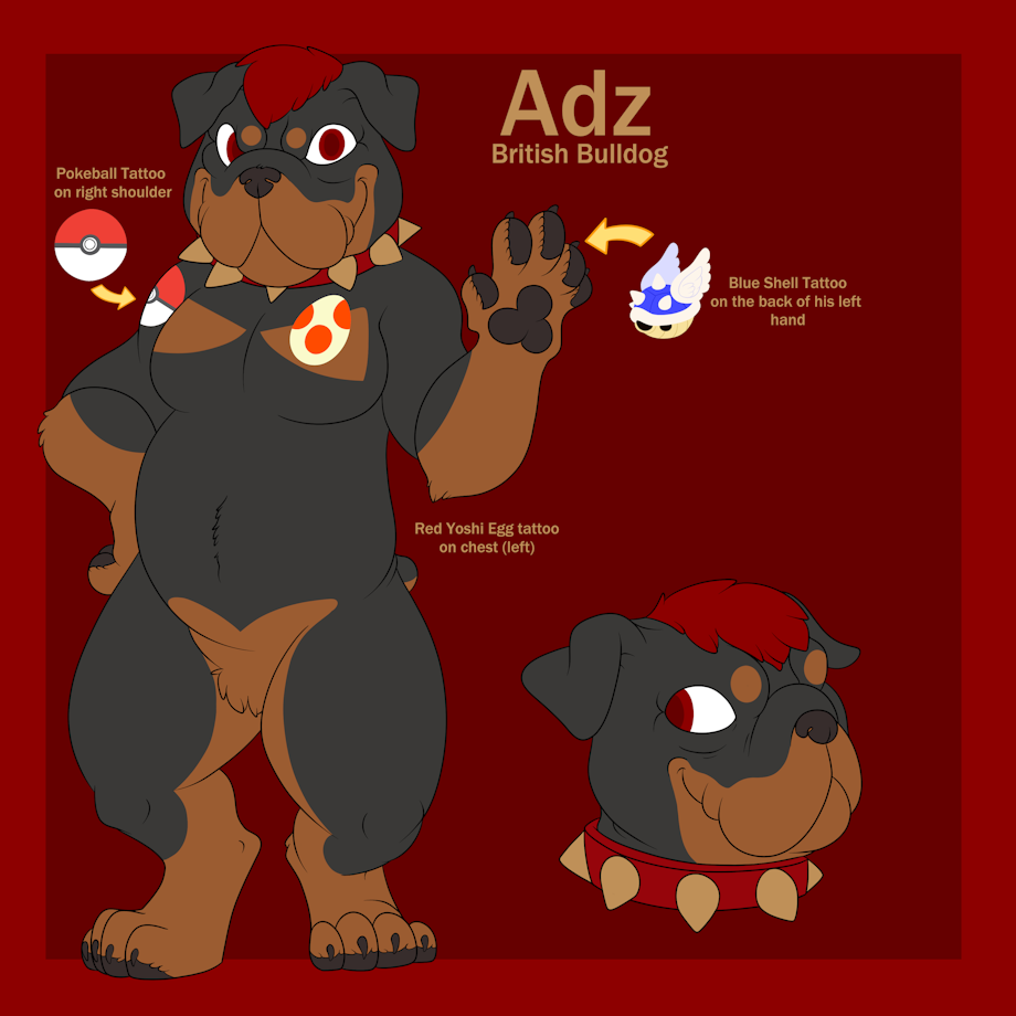 Here the reference sheet for my sona, a British bulldog named Adz (hes even polite enough to say hello to you).
