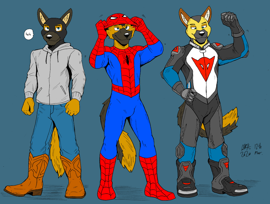 left - black balaclava ski mask, grey-ish silver hoodie, jeans and brown cowboy boots middle - a spandex spiderman suit right - rubber Gshep mask, dainese one-piece moto suit with match gloves and boots