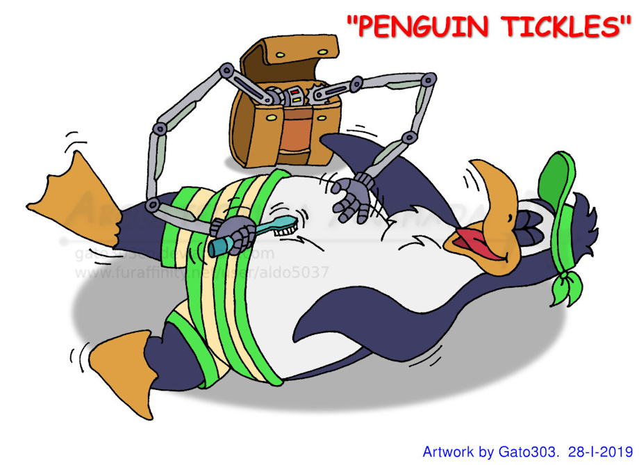 Commission for Bird-Lover, a penguin being tickled by robotic arms coming out from a backpack