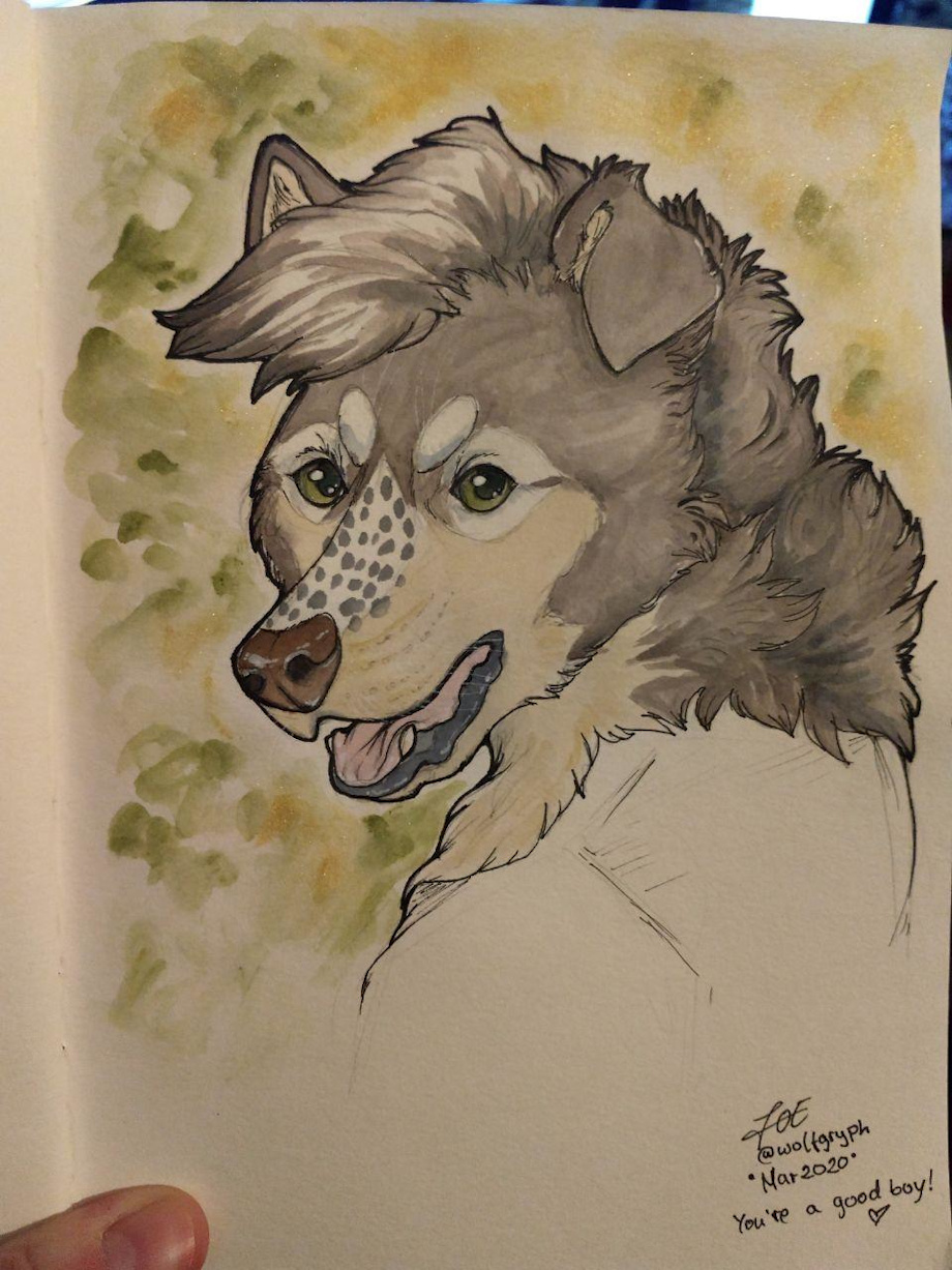Sketchbook entry for the fluffiest boy kikonine <3 I wanted to trade and he was willing to lend me his sketchbook :D Here, I had the same problem as before with Rakan's sketch (see here), where the paper is not suitable for watercolors.. Anyways.